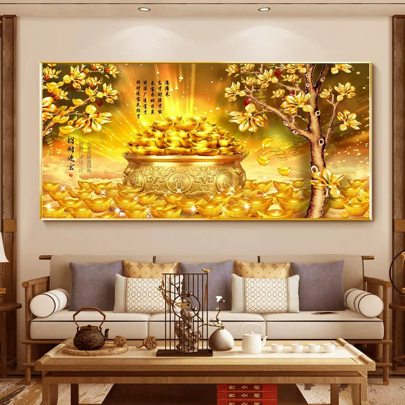主元素 “招财进宝”+ 全幅金元宝、聚宝盆,形成 “财气满溢” 的气场,主正偏财兴旺、财富持续聚集,契合客厅 “聚气生财” 的功能需求。