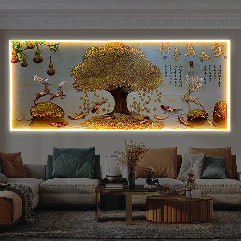 金色发财树:树干稳固聚宅气,金叶、落币对应 “财气凝聚、财源滚滚”,树下金元宝堆是 “积财守富” 的风水意象,主正偏财皆旺;